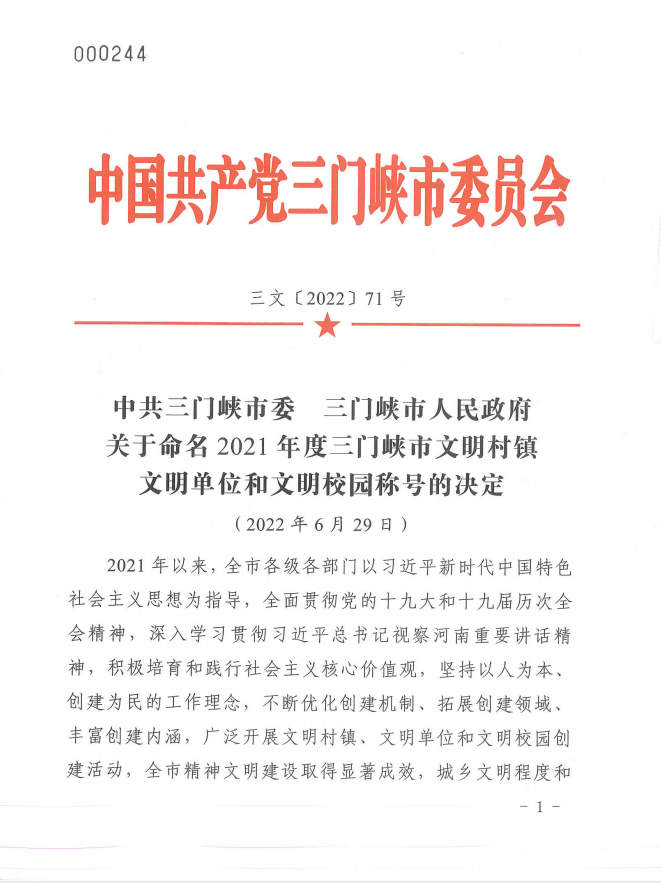 近日,三門峽市委、市政府印發(fā)《關(guān)于命名2021年度三門峽市文明村鎮(zhèn)、文明單位和文明校園稱號(hào)的決定》(三文〔2022〕71號(hào)),市文旅集團(tuán)榮獲“2021年度市級(jí)文明單位”稱號(hào)。